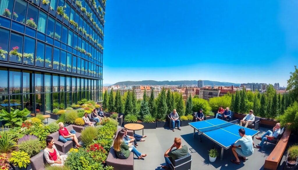 Las oficinas cuentan con zonas abiertas y luminosas, decoradas con arte moderno y espacios verdes, lo que contribuye a un ambiente acogedor. Además, se presta especial atención a la sostenibilidad, utilizando materiales reciclables y sistemas de energía eficiente.